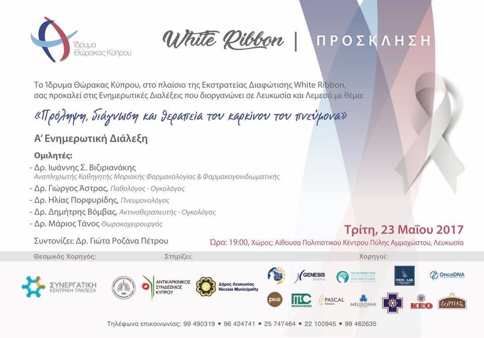 Στα πλαίσια της εκστρατείας “White Ribbon” του Ιδρύματος Θώρακα, ο Δρ Γιώργος Άστρας θα μιλήσει κατά την διάλεξη με θέμα “Πρόληψη, διάγνωση και θεραπεία του καρκίνου του πνεύμονα”.