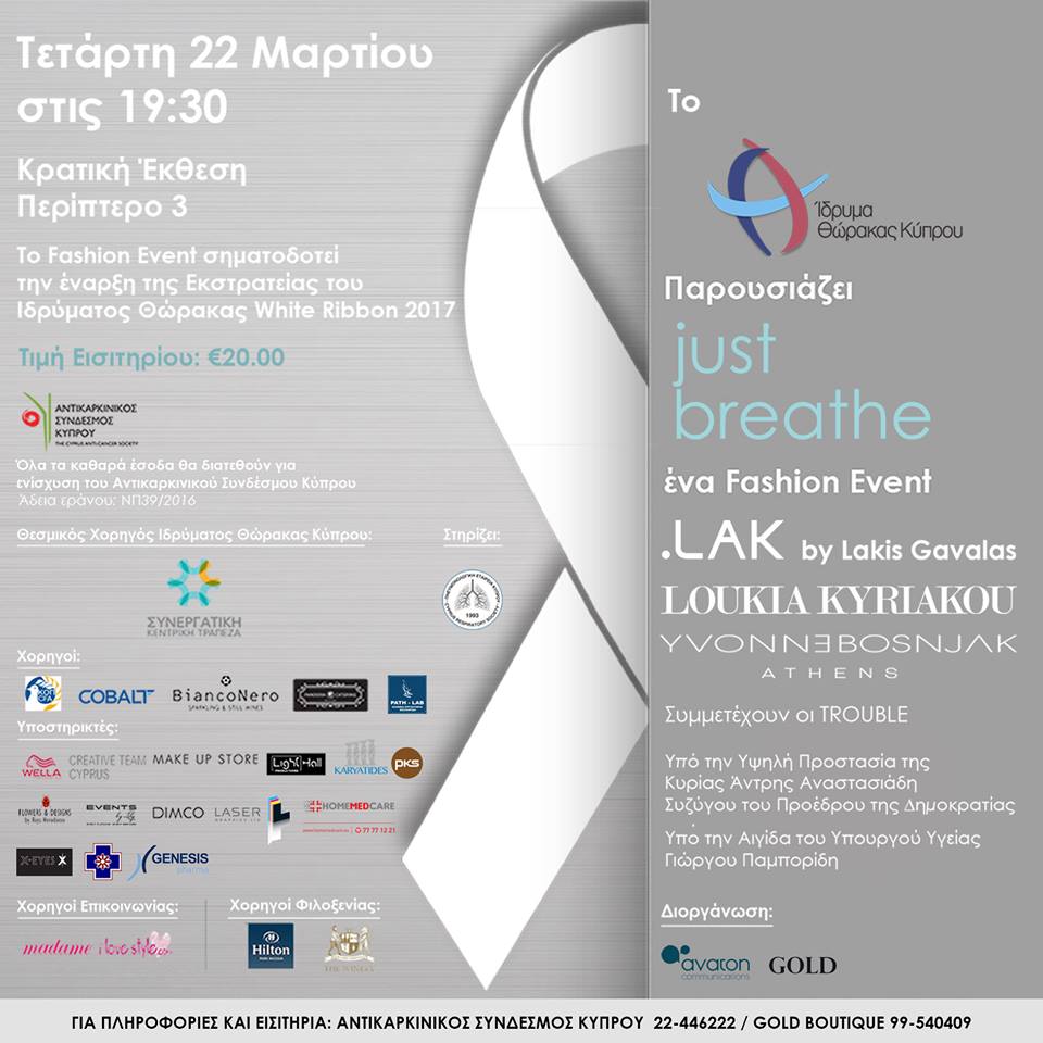 Την έναρξη των εκδηλώσεων στις 22 Μαρτίου, σηματοδότησε το μεγαλύτερο Φιλανθρωπικό Fashion Event με τίτλο “Just Breath”, με τη συμμετοχή των γνωστών σχεδιαστών Λάκη Γαβαλά, Λουκίας Κυριάκου και Υβόννης Μπόσνιακ. ⠀