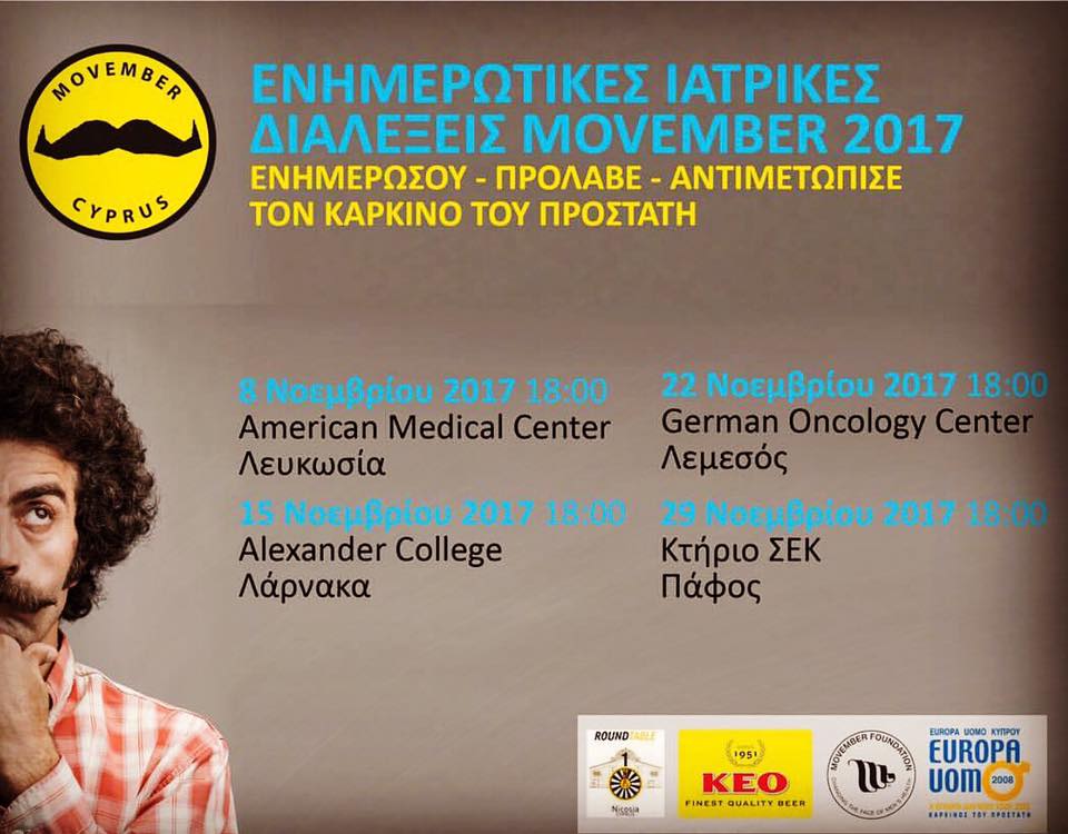 Πολύ σημαντικό μέρος κάθε εκστρατείας του Movember Cyprus είναι οι ενημερωτικές ιατρικές διαλέξεις, που πραγματοποιούνται φέτος σε όλες τις πόλεις. Πραγματοποιήθηκε ήδη η πρώτη διάλεξη στις 08/11 στο American Medical Center στη Λευκωσία, ενώ ακολουθούν οι διαλέξεις στις 15/11 στο Alexander College στη Λάρνακα, στις 22/11 στο German Oncology Center στη Λεμεσό και στις 29/11 στο Κτήριο ΣΕΚ στη Πάφο. Ο Δρ Γιώργος Άστρας θα είναι ομιλητής σε όλες τις διαλέξεις για να μιλήσει για τις μεθόδους πρόληψης και θεραπείας του καρκίνου του προστάτη. Όλες οι διαλέξεις ξεκινούν στις 18:00.